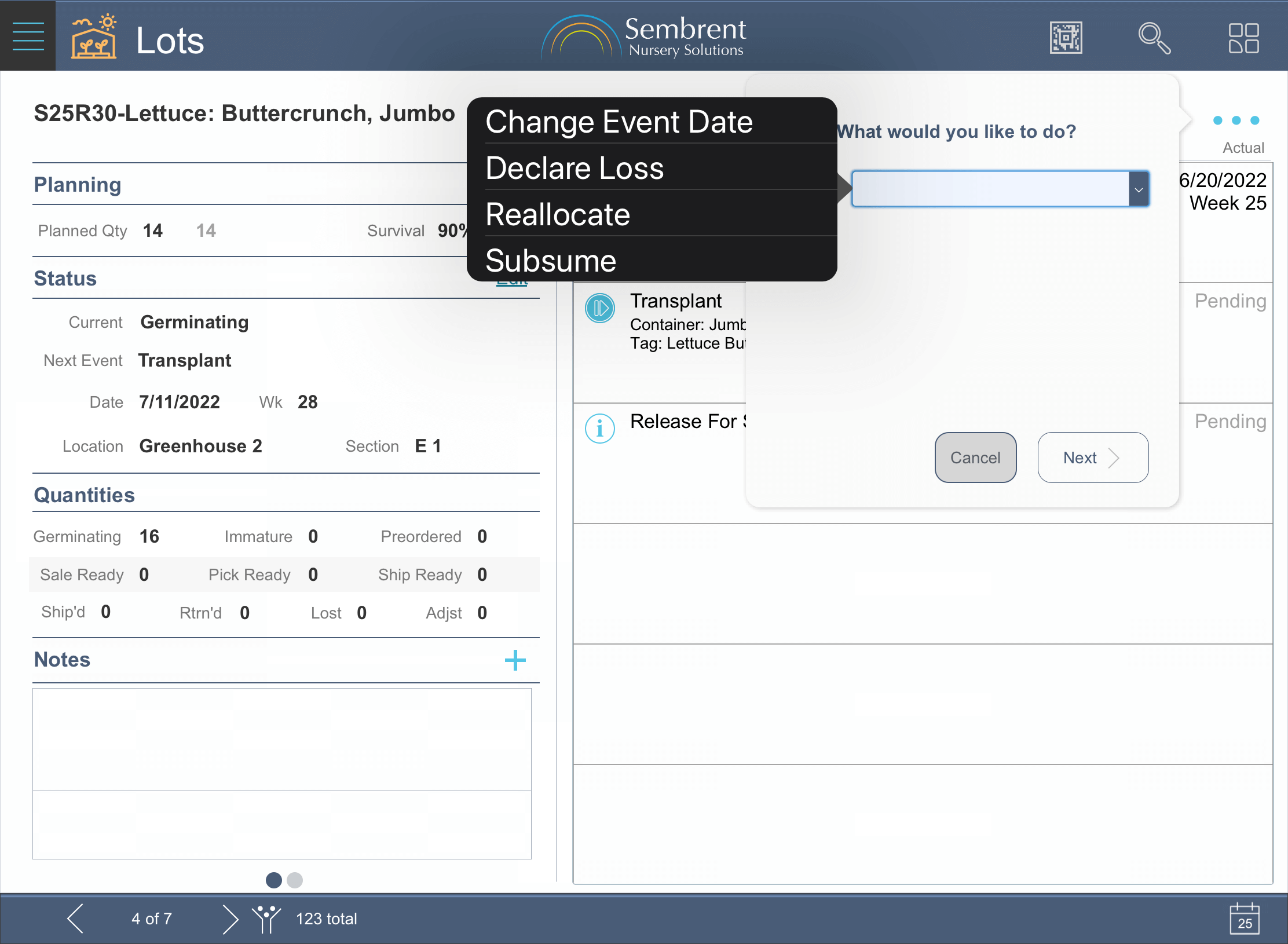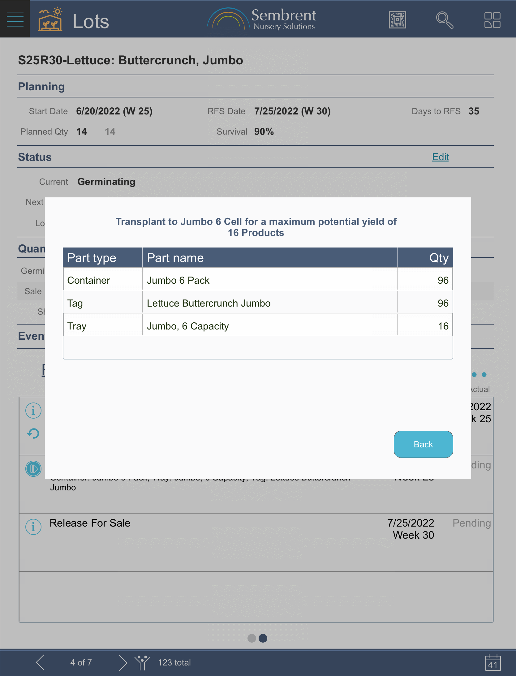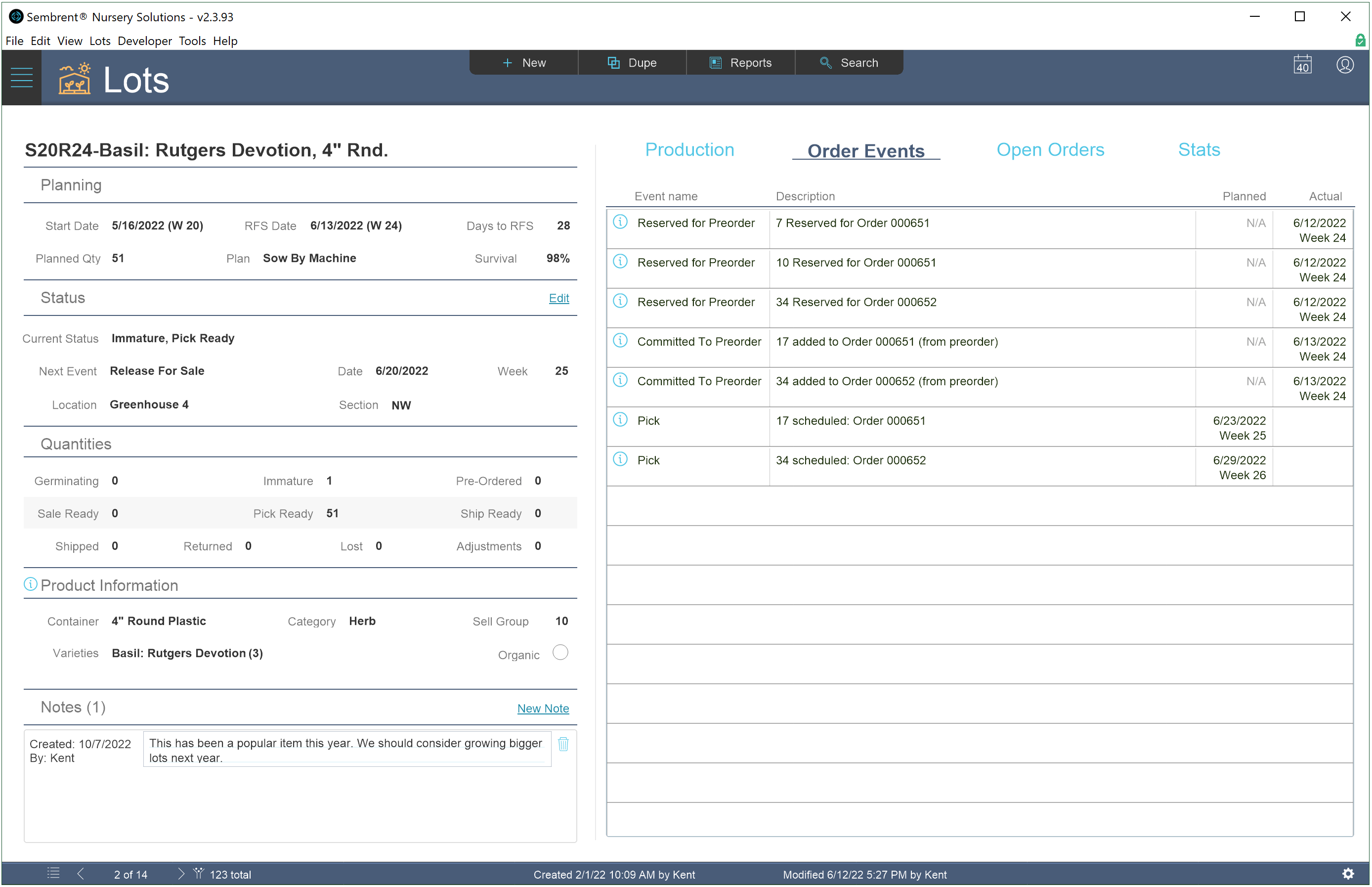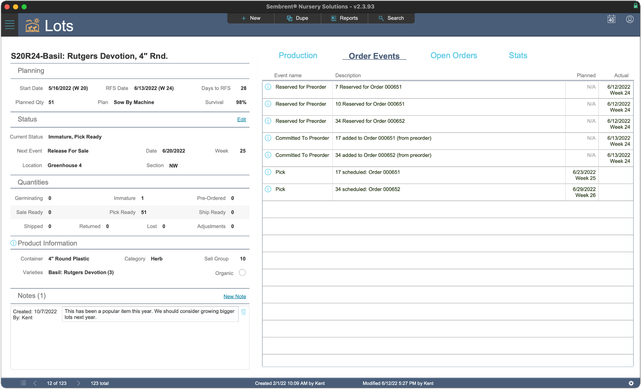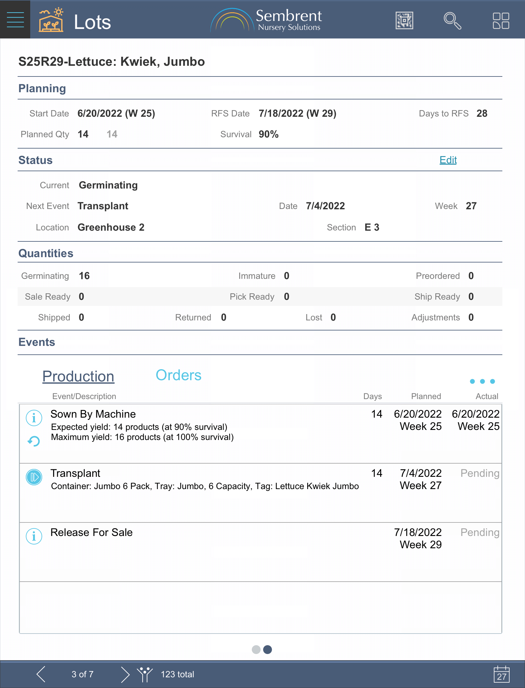 Planned and actual quantities on hand are tracked for each part. Both levels are adjusted automatically when production events are recorded that use those parts (e.g., a transplant would adjust quantities for the container it’s moved to).